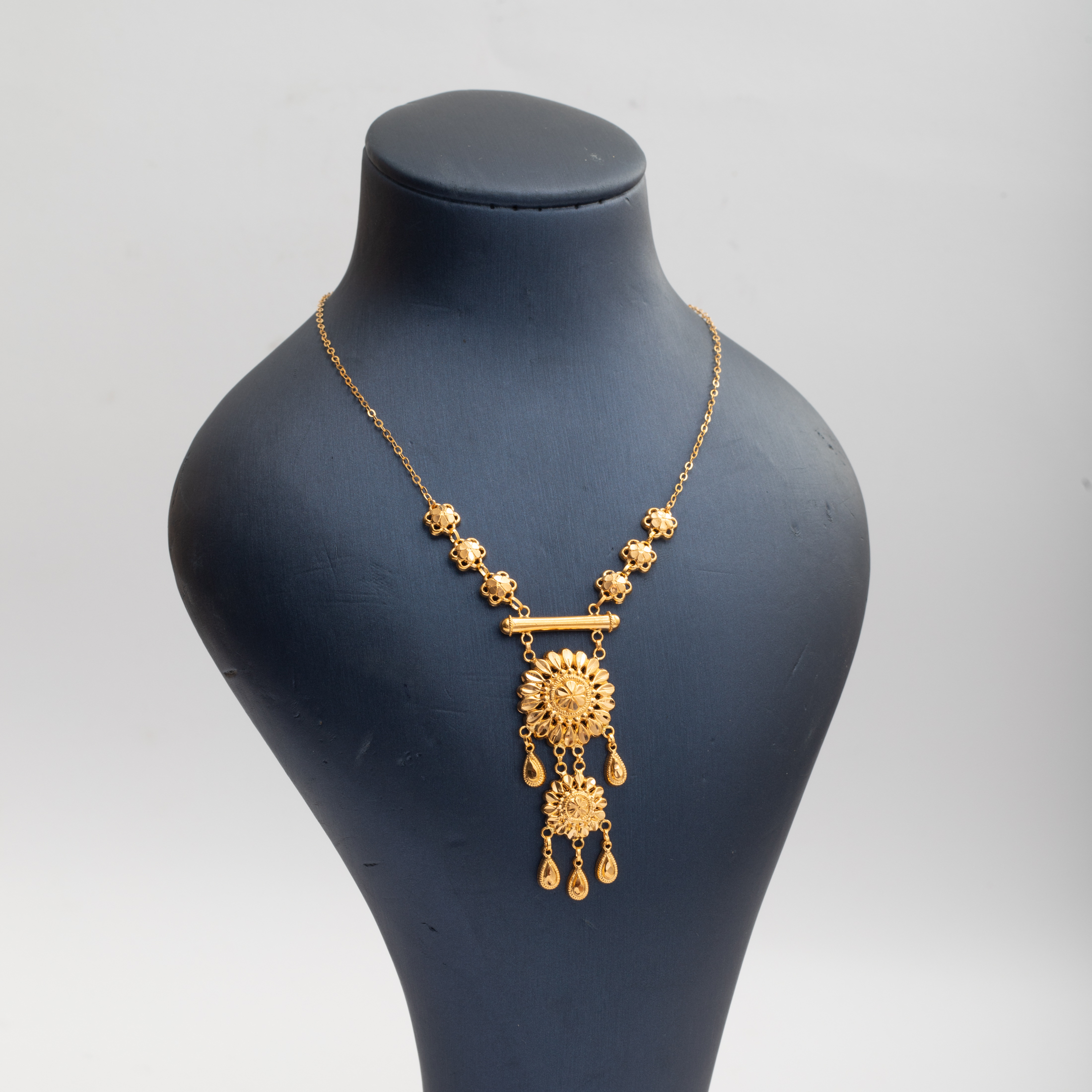 تصميم أنيق ومصنوع بعناية فائقةمن الذهب الخالص عيار 21 الذي تم استخدامه لهذا العقد يمكن ارتداؤه بشكل يومي أو في المناسبات الخاصة لإضافة لمسة فاخرة مناسب للاستخدام اليومي والاهداء يتميز العقد بكونه قطعة فريدة من نوعها، لا بد أنه سيكون هدية مثالية لأحبائك.